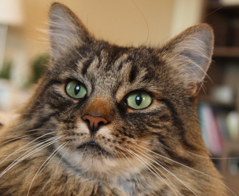 Kortere hår på venstre bakbein etter at han opererte og satte inn protese i kneet etter påkjørsel i januar -16. "Makrell-mønster" i pels. Mellomstor. Lengre svarte hår på halen sammenliknet med kroppen. ID-merke i øret.