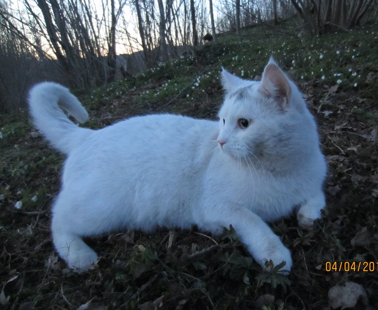 Maximus er hvit, men i panna er det noe svart. Han mjauer lyst.