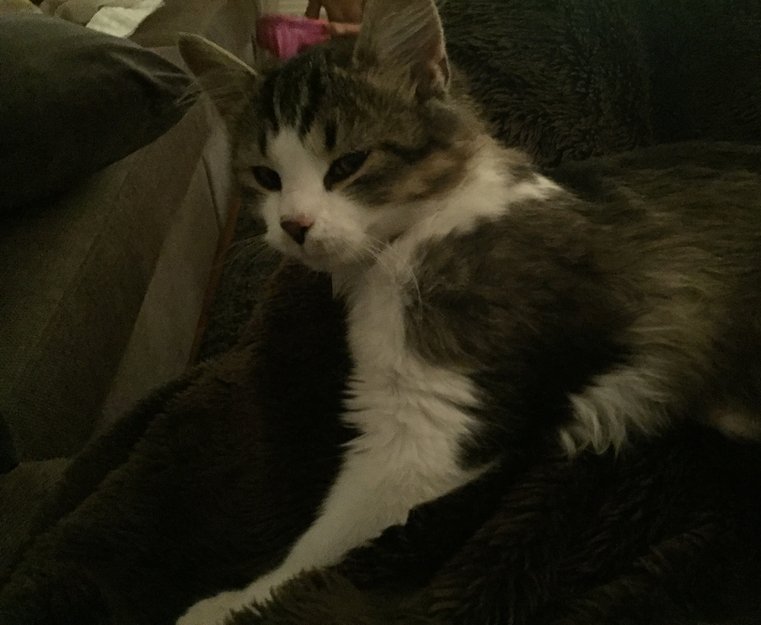 Veldig kosete, noen små flekker på nese. Hvit foran med grå brune striper