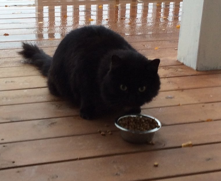 Katten er observert i nærheten av og på gården, innimellom siden i sommer. Den virker skeptisk til vår katt. I dag kom den opp på terrassen og jeg satt frem en skål med mat. Den var veldig sulten, litt sky og skvetten til å begynne med, men det viste seg at den er tam og veldig kosete. Svarer med tynn, lys stemme. Usikker på om det er en kastrert hannkatt, eller om det er er en stor hunnkatt. Halvlang sort pels, litt hvitt i brystet, grønne øyne og en langhåret hale som virker litt "slapp" i tuppen. Litt lange hår i ørene.