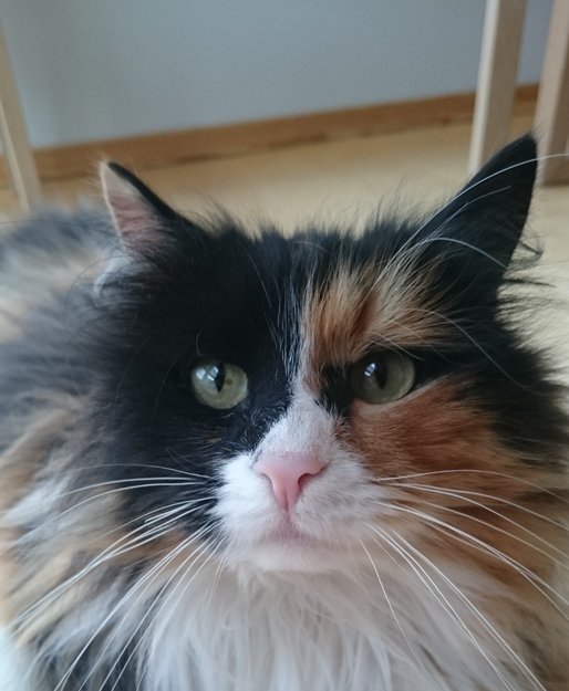 Dette er en stor hunnkatt med mye pels. Hun er lett å kjenne igjen med todelt farge på hodet. Hvit på brystet.