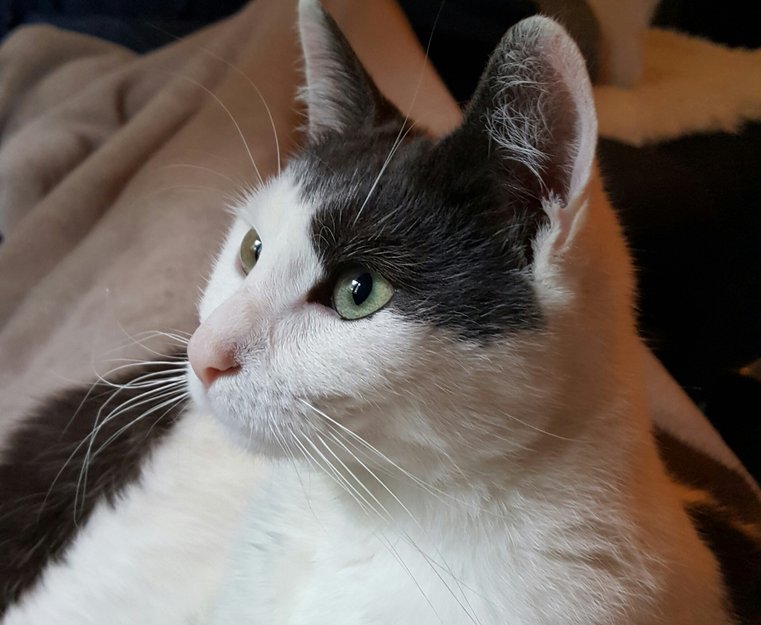 Hvit og grå med rosa nesetipp. Han er 1 år gammel, men litt liten for alderen. Korthåret, men lodden. Han er mest hvit med grå områder i ansikt, på rygg og hale. Hvit haletipp, og litt hvitspaglete i det grå på underside av hale.