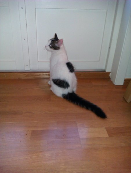 Hvit med to svarte flekker på rygg. Tillitsfull og kosete. Nylig kastrert.