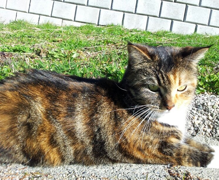 Nydelig tricolorpels, hvit under haka og på magen. Har chip og ID tattovert i øret. Er ganske liten og lett (i underkant av 4kg). Gul øyne, og hvite "sokker". Hun er 8 år, ganske bestemt dame, men også veldig kjælen. Kan ha gått inn i boder/garasjer.
