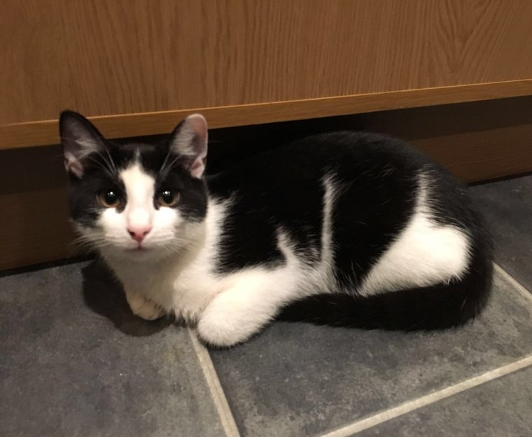 Svart og hvit katt, 1 år, svart rundt øynene. Kastrert, chip- og id-merket.