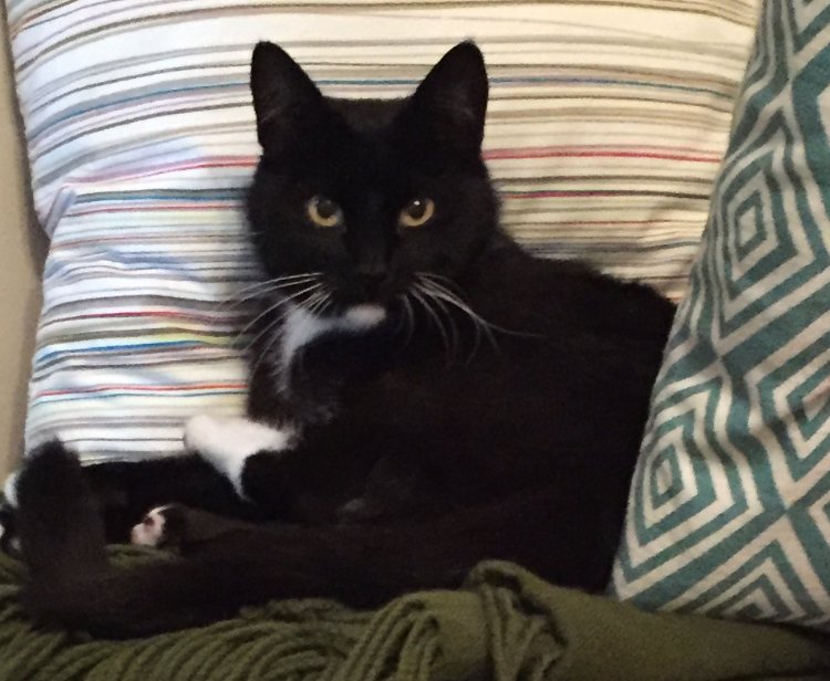 Svart med hvite værhår, poter og bakbein, hvit hake, beyst og mage. Litt sky ovenfor andre mennesker enn dem han kjenner. Hadde et rødt halsbånd med bjelle da han forsvant, men kan ha mistet det.