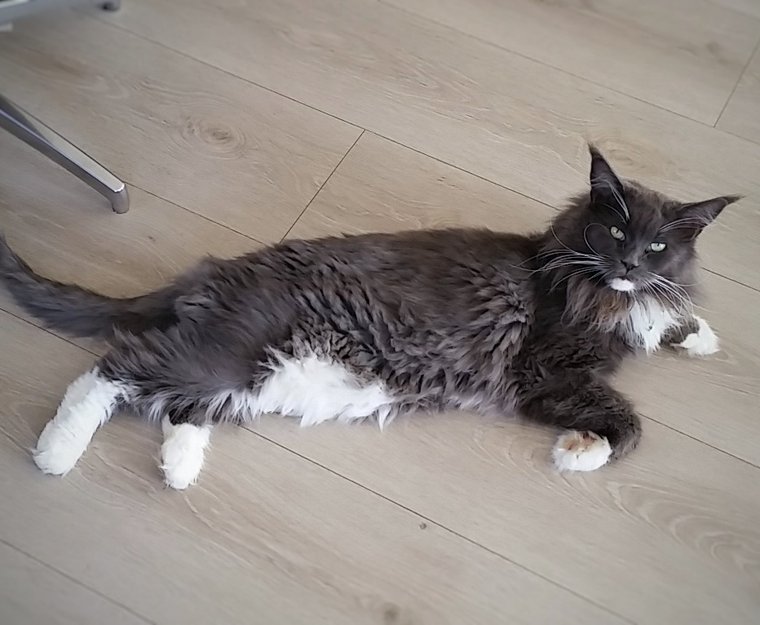 Maine Coon er kjent for sin store størrelse, gaupelignende ører og lange værhår. Phoenix er grå med hvit mage/poter og hvitt skjegg.