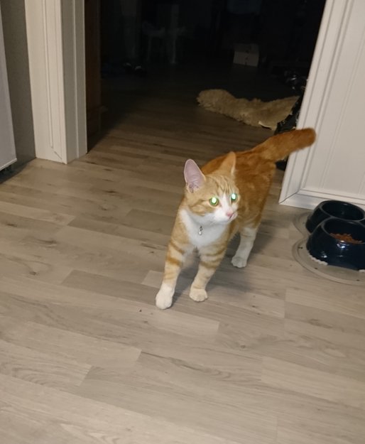 Katten er oransje og hvit i fargen, har svart halsbånd med bjelle på seg og tigerstripet. Hvit under magen, hvite poter og hvit tupp på halen.