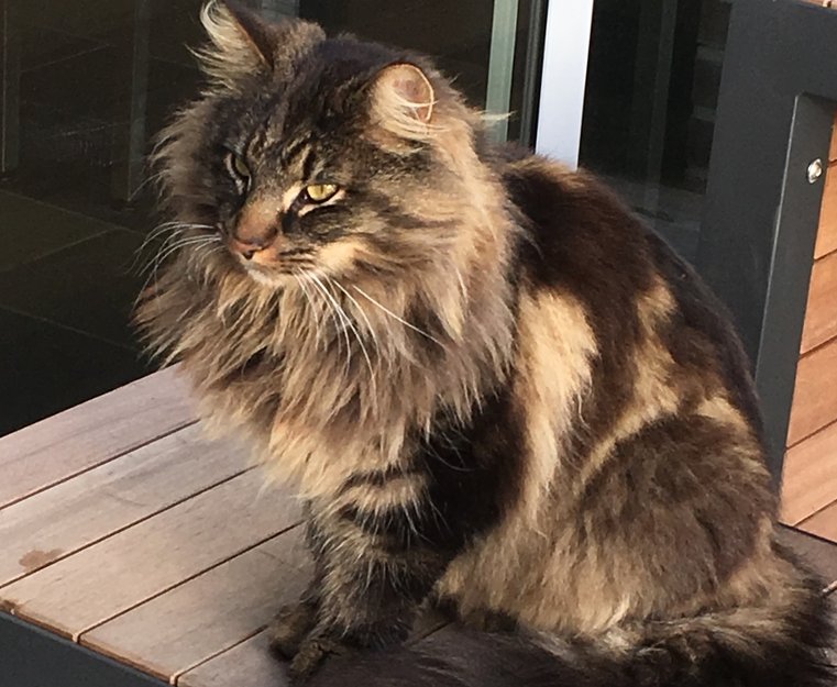 Langhåret, stor katt, sannsynligvis hannkatt. Ligner skogskatt. Voksen, snill, vant til mennesker.