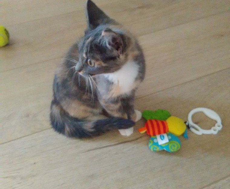 Mellomstor katt. Hun har en føflekk på bakre beinet.