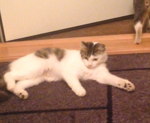 Lucy is rather small, has white / brown-tiger colours and a fairly high, squeeky voice. She is very chatty and cuddly but can ve a bit shy with unknown people.