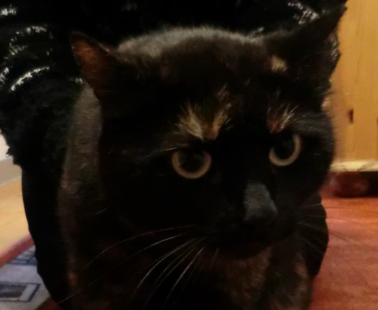 Dette er en hunnkatt, svart skilpaddefarget med tett og fin pels. Hun er tam og sosial , men likevel litt forsiktig. Var i godt hold da hun ble funnet. Hun er ikke chippet.