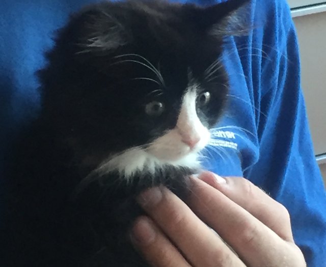 Svart stort sett over alt. Hvit fra nesa og under på magen. Hvite poter. Halvlang pels. Er veldig kosete og tøff. Liker å bli kost på magen. Er 4måneder.