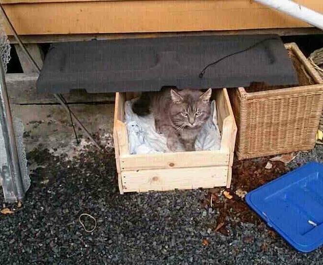 Den dukket opp og har ikke forlatt huset. Har fått seng ute og mat. Vil bli sjekket for chip ,så fort den er i bur. Ser ut til å ha gått ute en stund,sky