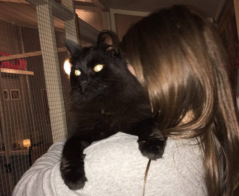 Sort, langhåret hannkatt. Tynn og med uflidd pels.