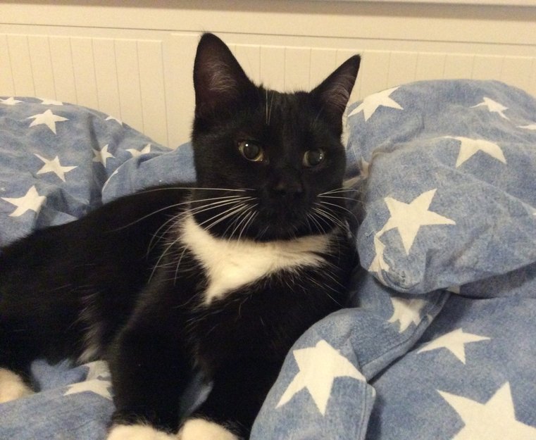 Sort katt med hvitt bryst og hvite poter. Litt over ett år gammel, slank og nett. I riktig lys kan det sees at pelsen på sidene er dypt brun med sorte striper, men hun fremstår som sort.