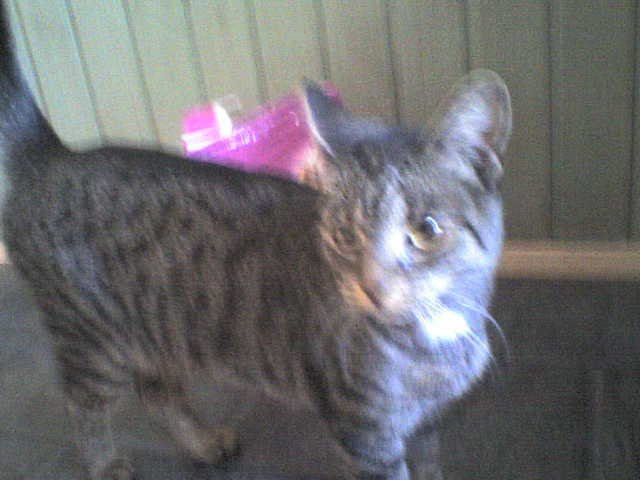 Lita grå/svart-tigerstripet hokatt med en liten hvit flekk i brystet. Litt hvit i venstre øyekrok, ei løs klo uskker hvilken fot