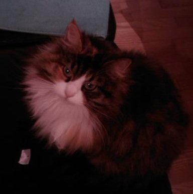 voksen hunkatt med lang pels. Mønstret i hvit, sort og brun.