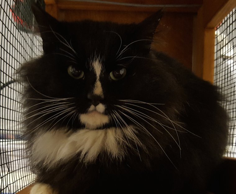 Langhåret sort og hvit ukastrert hannkatt uten ID oppholdt seg på Bånnkall Gård siden begynnelsen av August 2016. Tatt inn av Katter i Nød 22.11.2016.