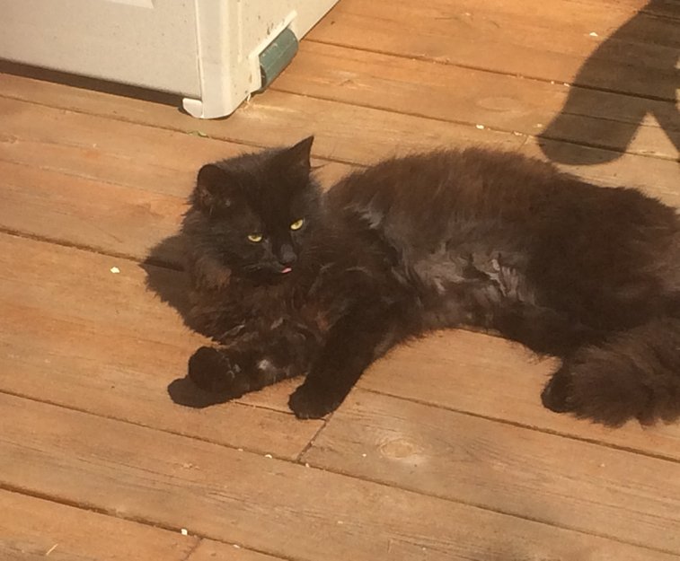 Han har nå barberte flekker flere steder, bl.a på bakkroppen, og venstre forlabb der han har sår etter slosskamp. Han er svart som natta, små kulrunde grønne øyne, langhåret, "løvemanke" rundt hodet og en stor hale. Han har derimot små labber.