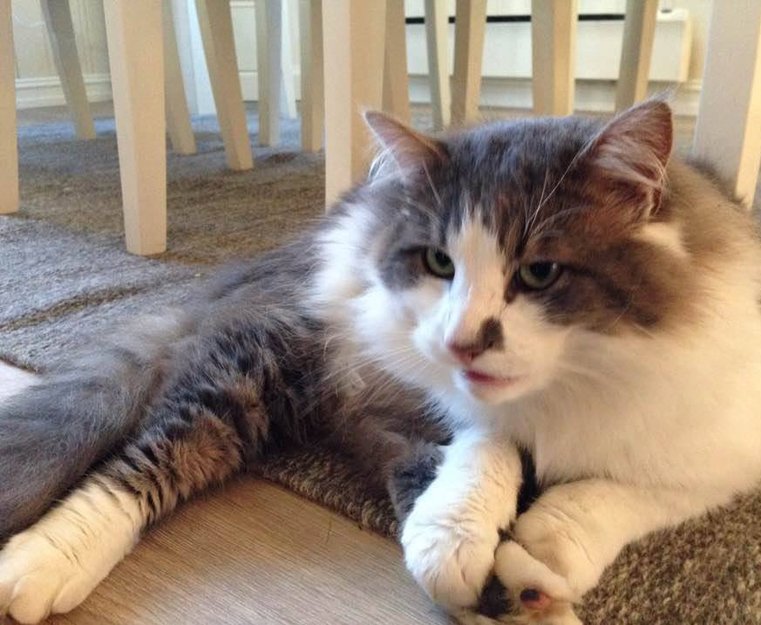 Stor ukastrert hannkatt. Ca 6-7 kg. Gråspraglete og hvit med en flekk på ene siden av snuten. Sosial og kjælen.