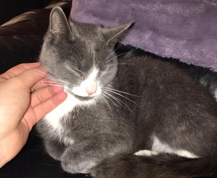 Dukket opp hos en familie. De kunne ikke passe på henne lenger og hun er tatt inn i fosterhjem i regi av Kattehjelpen Drammen og omegn. Har fått behandling hos veterinær grunnet et sår på halsen etter en klo.