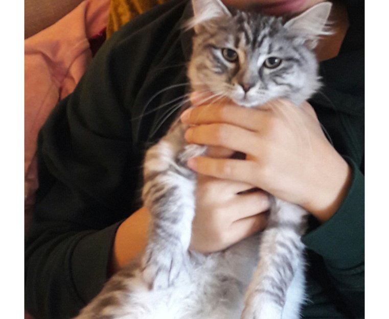 Langhåret og lys på bryst, mørkere gråsvart på ryggen. Fine tegninger i ansikt og nydelige tigerstriper på labber.