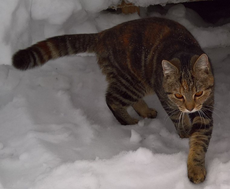 Hun er en liten hunkatt, ca. 3 kg. Det er noen antydninger til rødt på ryggen hennes. Hun er folkekjær og vil nok gjerne gå inn hos folk.