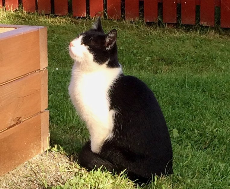 Katten er sort og hvit korthåret, og dukker opp med jevne mellomrom i tun 3 i Nyveilia. Det ser ut som det er en ung ukastrert hannkatt. Han har lurt seg inn i hus av og til, og prøver å stjele mat hvis han får anledning. Vi har forhørt oss litt i nabolaget uten å finne ut hvor katten hører hjemme. Nå forsøker vi å annonsere han her for å nøste litt i saken, og for å finne ut om han bare er på luftetur eller om han har tullet seg vekk fra hjemmet sitt.