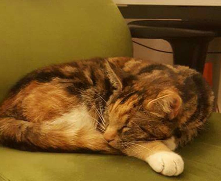 Gikk utenfor jobben til kona mi i dag og ville inn. Tok den inn og så hjem. Den har ID-tatovering, så tar den med til veterinær i morgen. Hun ser tynn ut, spiser mye og sover.