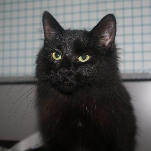 Langhåret, svart hunnkatt med en liten hvit flekk i brystet(synes nesten ikke). Hun er ca 10 - 12 mnd. Ikke id-merket.