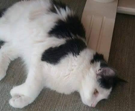 1 1/2 år gammel hunkatt, hvit med mørkegrå flekker på rygg, hode og hale. Savnet siden torsdag ettermiddag, tillitsfull og lyder navnet sitt