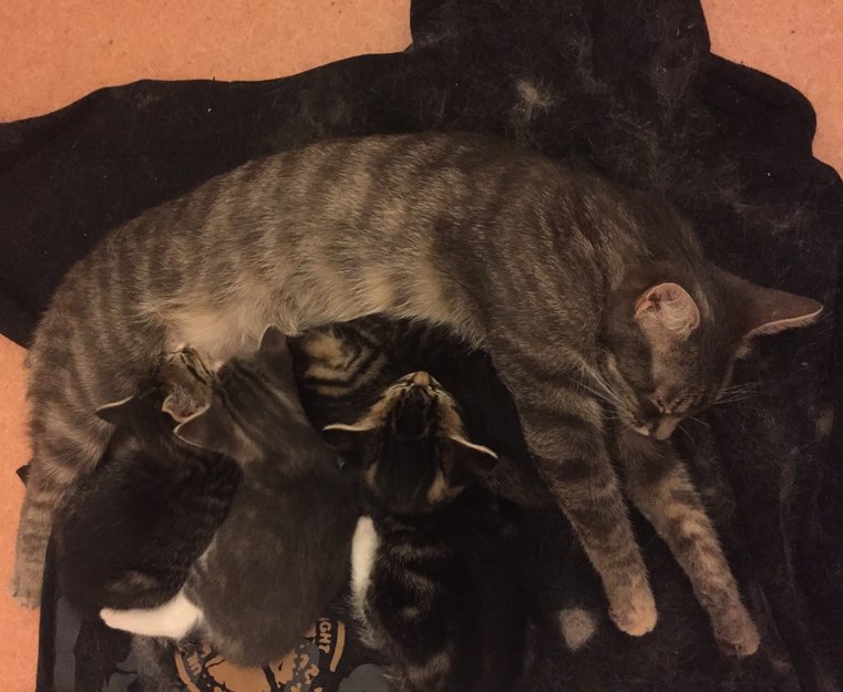 Den pleier aldri å være vekke mer enn maks litt over 1 time når den har kattunger! Og jeg fikk en mistanke til at noen kanskje hadde kidnappet den og kjørt den vekk av div årsaker.