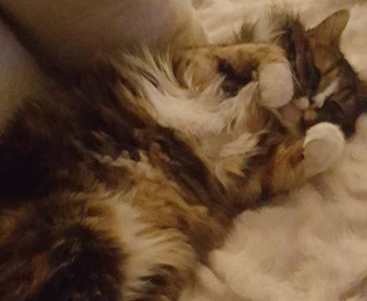Har ikke sett katten selv, den er langhåret og spraglete/ 3farget? Hvit snute/rundt munn, hvite forlabber