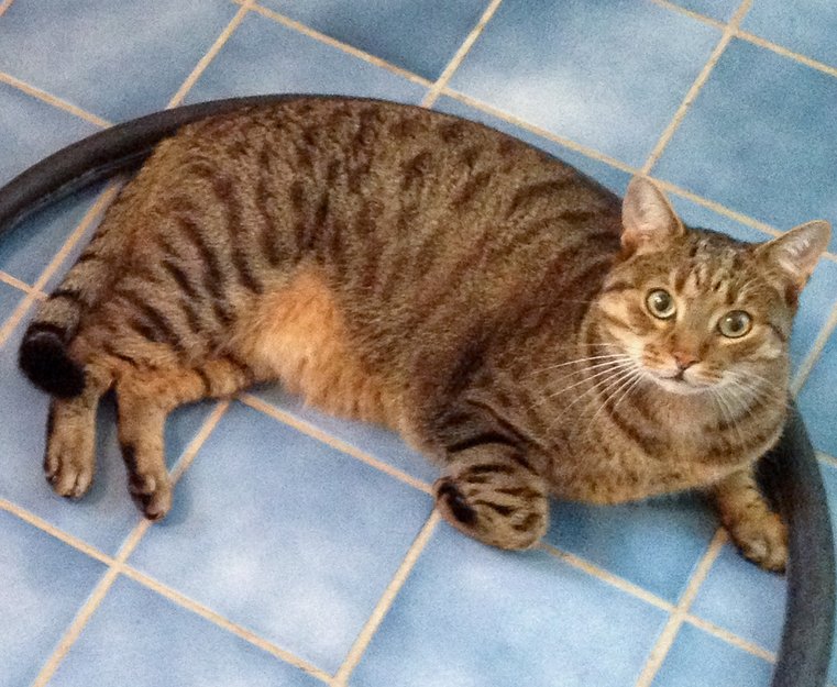Tigerstripet "godt matet" hankatt, med striper som er nesten punkter.
