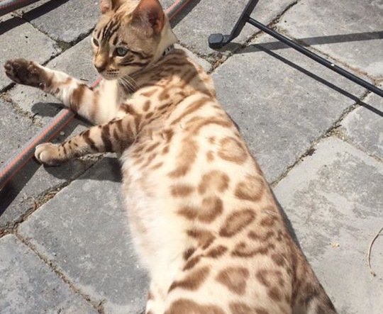 Bengalkatt. Har svart halsbånd med tlfnummer. Lysebrun med mørkere rosetter/flekker og striper. Ser ut som en miniatyr-gepard.