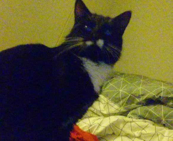 han er svart, med hvit pels i ansiktet, som ser ut som en bart. han han er også hvit på brystet. potene er hvite. han har grønne øyne