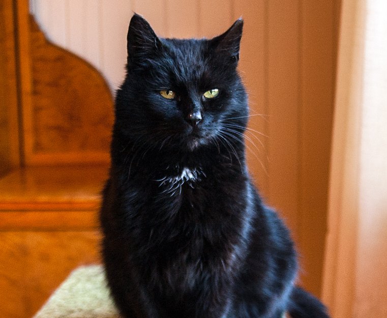 Hun er ikke så stor, fire - fem år gammel i flg. veterinær. Pelsen er blank og helt svart. Hun har gulgrønne øyne som er litt "triste" og sitter litt tett sammen. Det venstre øyet har en pigmentflekk nær pupillen.