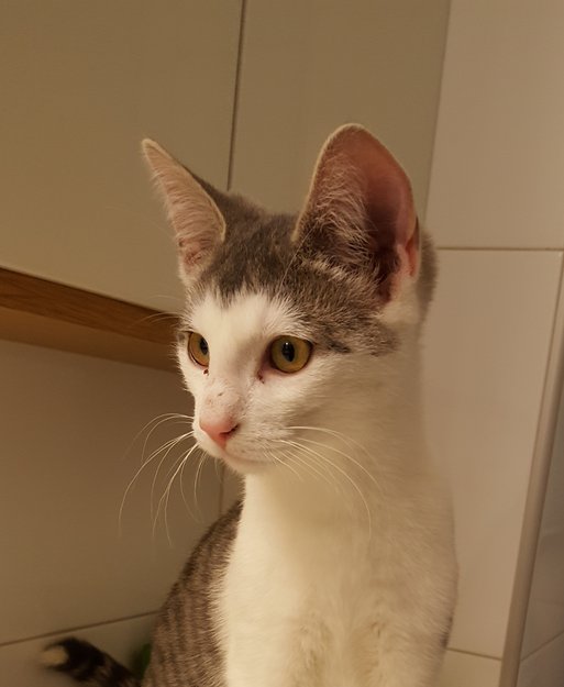 Katten kom på julaften, men ble jagd bort av vår pus. Da den kom tilbake på morgenen, ble den nok en gang jagd. Da den returnerte, tok vi den inn for å holde de to katten adskilt. Så ringte vi politiet som kom, men den var dessverre ikke chippet. Den har bodd i soveromsgangen vår etter det.