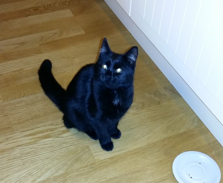 Liten hunnkatt. Kort sort pels (med noen hvite hår på brystet). Dyrlege finner ikke chip, og anslår alder til ca 1/2 år. Katten er tatt inn og gitt mat/vann. Sover inne hos to naboer inntil videre. Katten går ikke ut selv og forsvinner ikke når den blir sluppet ut. Forsøkt å gå rundt i området med den - går ikke bort. Antagelig ikke kastrert. Kontakt med Dyrebeskyttelse etablert med tanke på omplassering om eier ikke melder seg snarest.