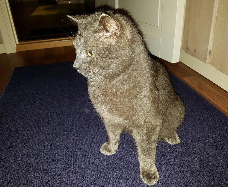 Mens vi var borte i jula har en grå hankatt benyttet katteluka til å komme inn til oss og spise kattemat. Av og til har denne katta også sovet inne.