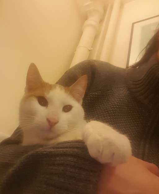 Fant en hvit og oransje/rød katt i snøen på Løren ved rema 1000.JDen lå inn i en grop ved vegen.å mjauet Jeg gikk bort til den å den klatret opp på meg.Den klorte seg fast å ble sitende på skuldrene mine.Jeg ba noen gå på butikken å kjøpe kattemat.Den fulgte etter meg da jeg snudde.Jeg har den hjemme hos meg nå på sinsen