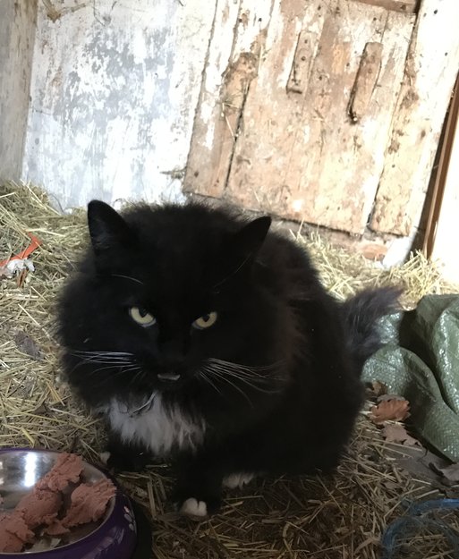 Svart langhåret katt har oppholdt seg i uthuset hos oss en god stund. Hvit under haken, hvit ytterst på frambeina og hvite bakbein. Veldig kontaktsøkende