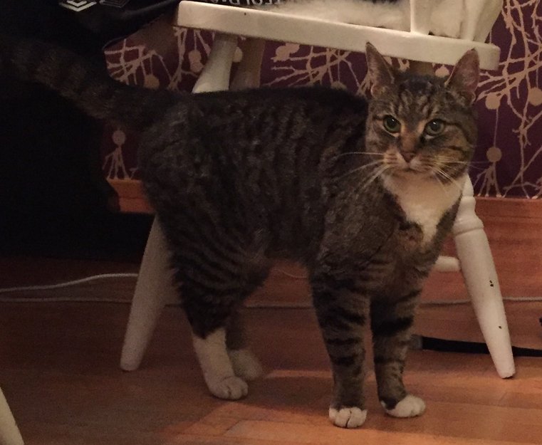 Tror det er hunnkatt. Veldig kosete. Gråstripete, hvit hals, hvite poter med sorte flekker under bakpotene, liten knekk ytterst på halen. Lite hakk i venstre øre.