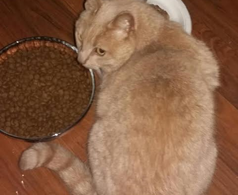 Etter et veterinærbesøk kan vi fastslå at pus er en ikke helt ung, kastrert hannkatt uten noen form for id merking. Ca. 5 år+ . Frisk og fin ( mye tannstein ) , og veldig takknemlig for å ha kommet seg innendørs. Skikkelig kosebamse som helt klart har hatt et veldig godt hjem. Ensfarget lys rød ( veterinær sier fargen heter Rød Creme i utstillingsmiljøet ). Tigerstriper på halen.