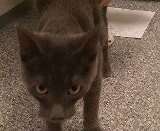 Grå korthåret , liten hvit flekk i brystet, veldig tynn kattunge hann, ca. 5-6 mnd. veldig kosete. Ukastrert og uten chip funnet i Rugdeveien, Jessheim.