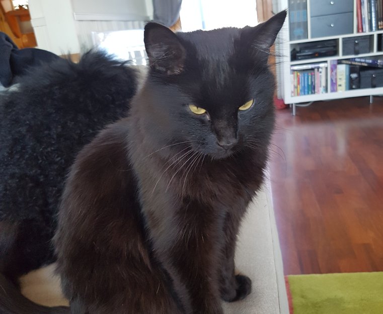 Han er helt svart, langhåret, gule øyne og litt lange hjørnetenner.