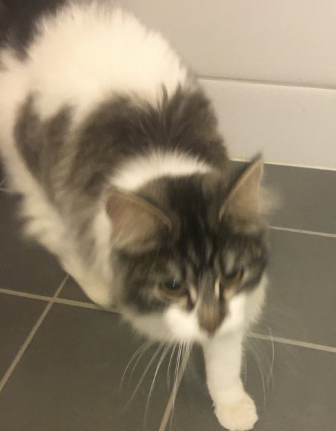 Pusen har vandret i hagen timesvis og viser veldig tegn til at hun vil inn, ble veldig glad for menneskekontakt. Pusen virker dehydrert og drakk masse vann. Vil bare være i nærheten og koser. Banket lenge på alle vinduer og ville ha kontakt så jeg tok den inn for å prøve å finne eier.