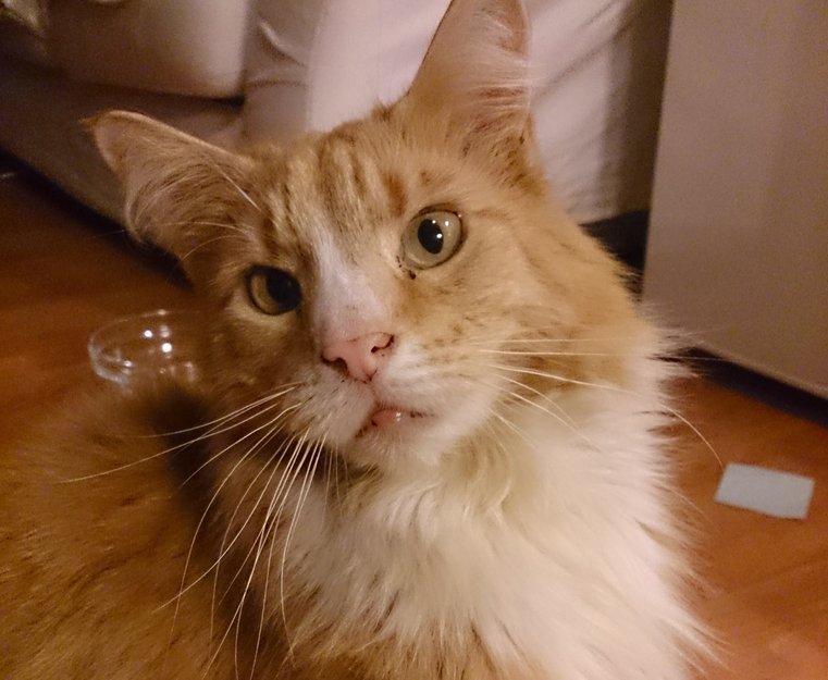 Langhåret orange med hvitt bryst og hvite poter. Han er også litt hvit i ansiktet.