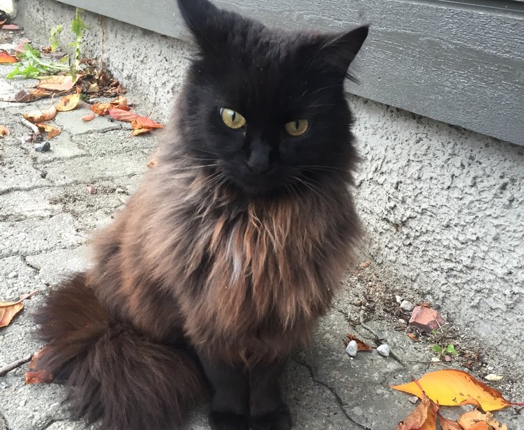 Langhåret svart med litt brunt. Har to barberte bare flekker på sidene bak, etter besøk hos dyrlege. Lang veldig bustete hale. Han er skeptisk til nye mennesker og går ikke bort til folk han ikke kjenner.